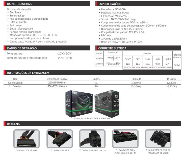 FONTE ATX 500W 80 PLUS WHITE EZ889 - KMEX